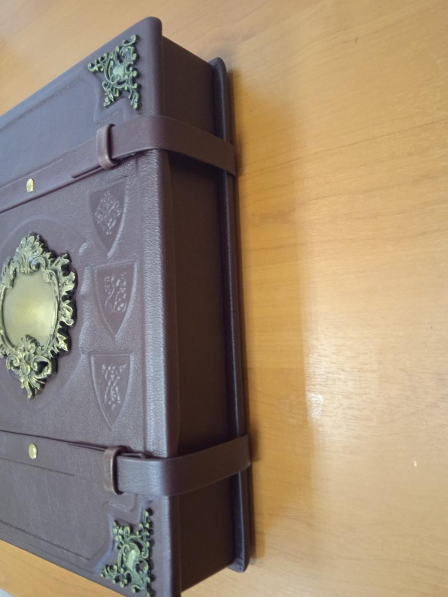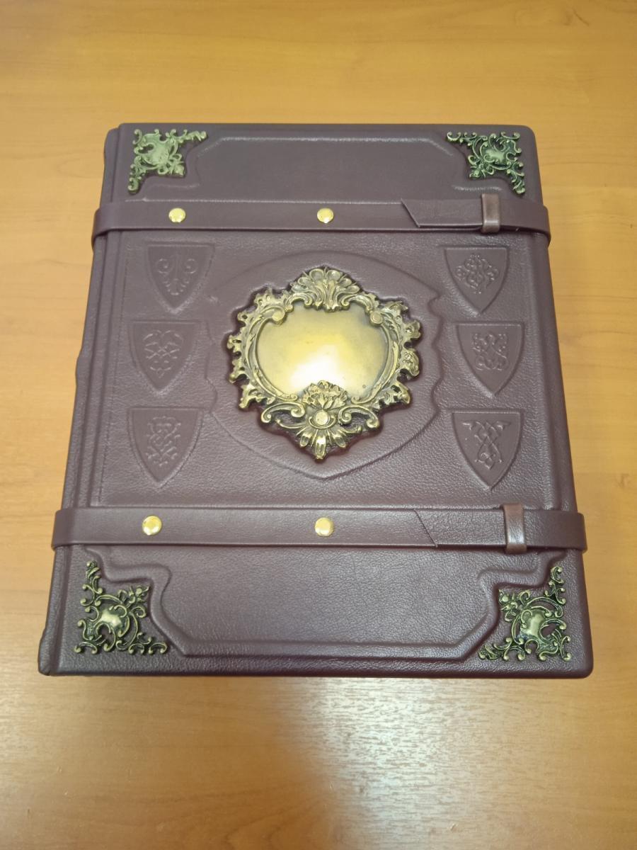 Обложка родословной книги выполнена из дерева (пластины МДФ) и вручную обтянута качественной натуральной кожей. Закрывается она двумя кожаными ремешками.