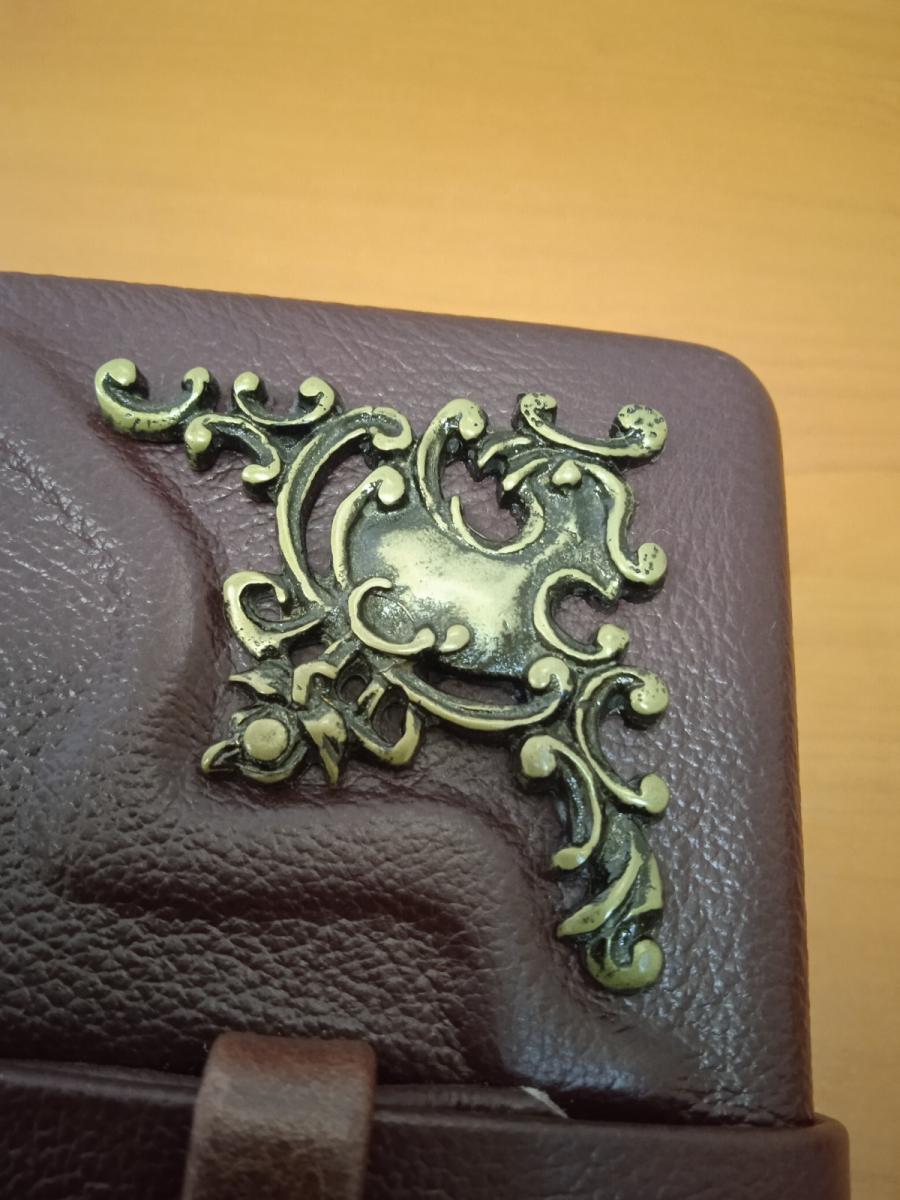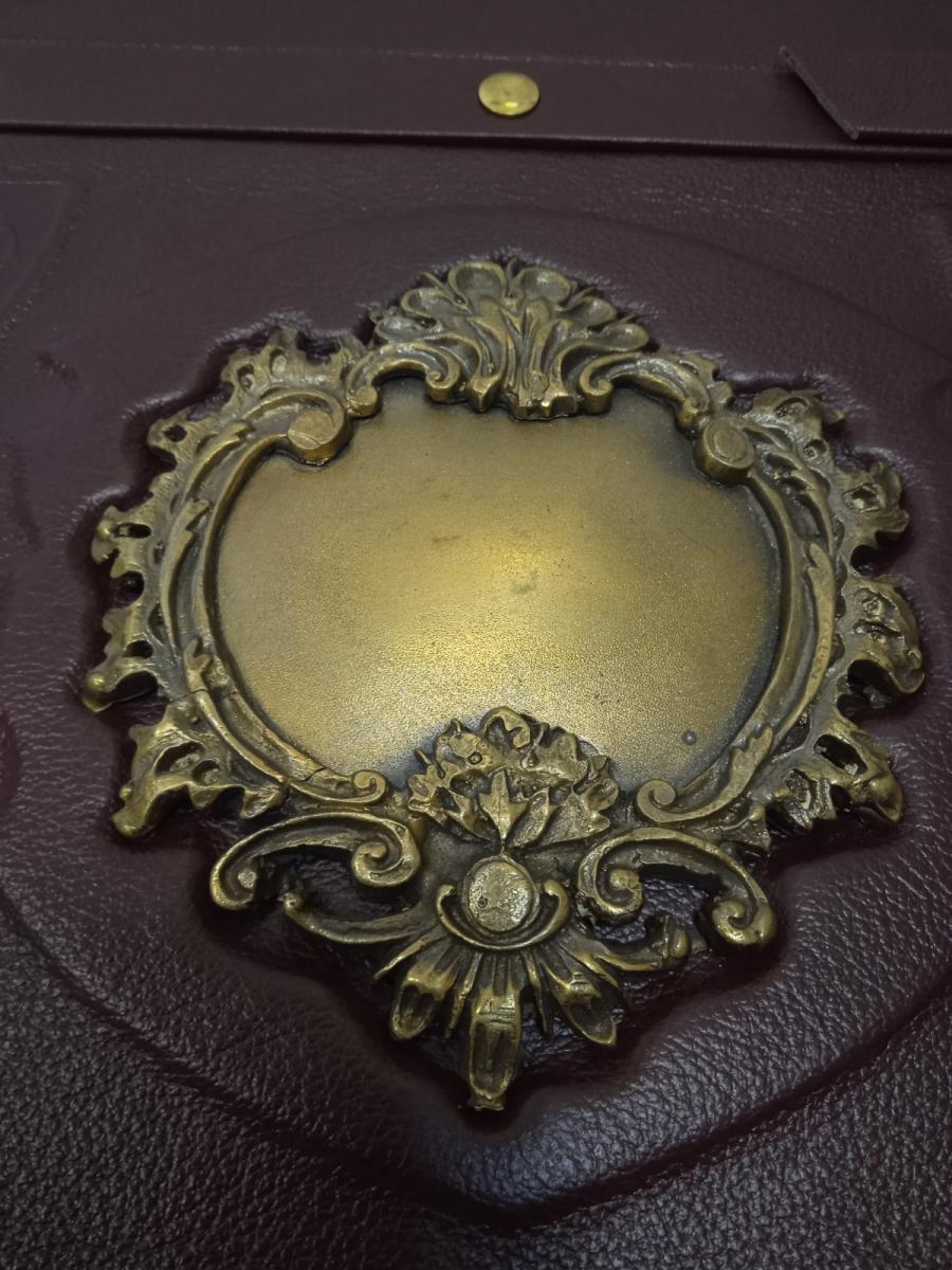 Корешок футляра выделен бинтами (выпуклыми округлыми элементами). Лицевая сторона украшена блинтовым (т.е. выполненным без фольги) тиснением, бронзовой накладкой с зеркальной поверхностью для нанесения монограммы или подарочной надписи и 4-мя литыми бронзовыми уголками.