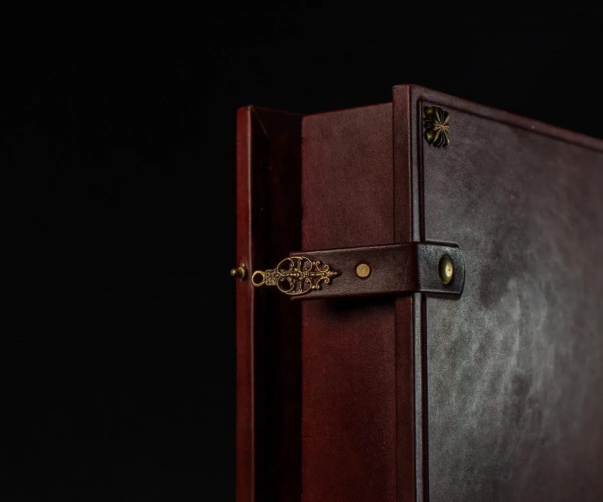 Листы книги скреплены с помощью позолоченного D-образного кольцевого механизма, так что их можно дополнять или удалять по вашему желанию.