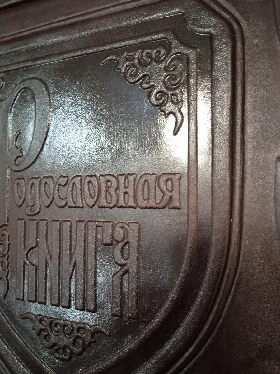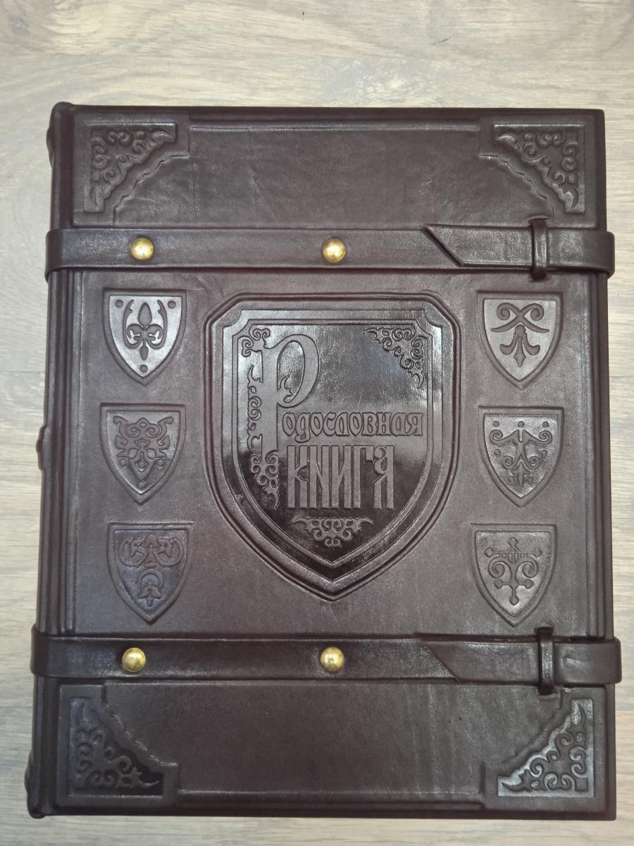 Обложка родословной книги выполнена из дерева (пластины МДФ) и вручную обтянута качественной натуральной кожей. Закрывается она двумя кожаными ремешками. Корешок обложки выделен бинтами (выпуклыми округлыми элементами). По центру футляр украшен блинтовым (т.е. выполненным без фольги) тиснением.