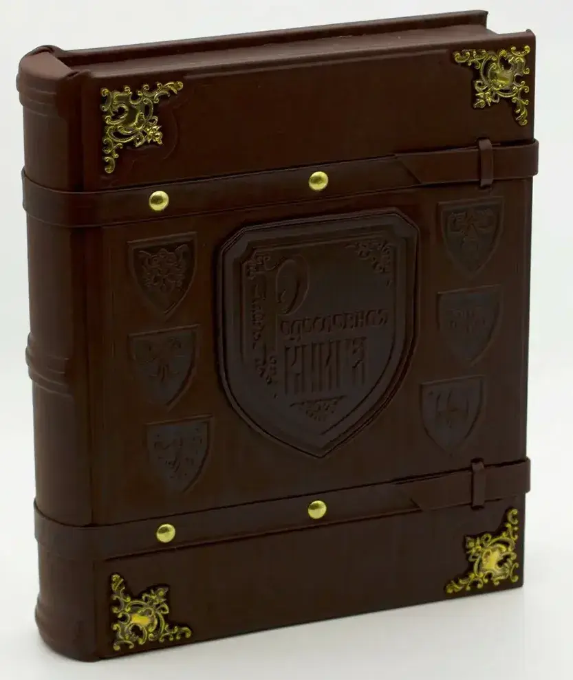 Обложка родословной книги выполнена из дерева (пластины МДФ) и вручную обтянута качественной натуральной кожей. Закрывается она двумя кожаными ремешками. Корешок футляра выделен бинтами (выпуклыми округлыми элементами). Лицевая сторона украшена блинтовым (т.е. выполненным без фольги) тиснением и 4-мя литыми бронзовыми уголками.