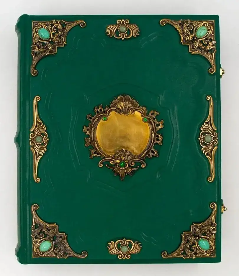 Обложка родословной книги выполнена из дерева (пластины МДФ) и вручную обтянута качественной натуральной кожей. Корешок обложки украшен бинтами (выпуклыми округлыми элементами). Украшен футляр «Славянской» рамкой, состоящей из четырех бронзовых уголков и четырех протяжек, украшенных кабошонами из яшмы и бронзовой накладкой «Барокко» с зеркальной поверхностью для нанесения монограммы или подарочной надписи. На лицевой стороне обложки имеется бронзовая накладка и зеркальная поверхность для нанесения монограммы или подарочной надписи.
