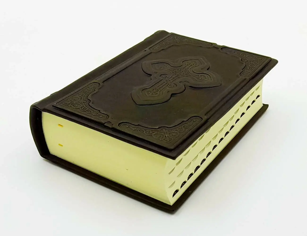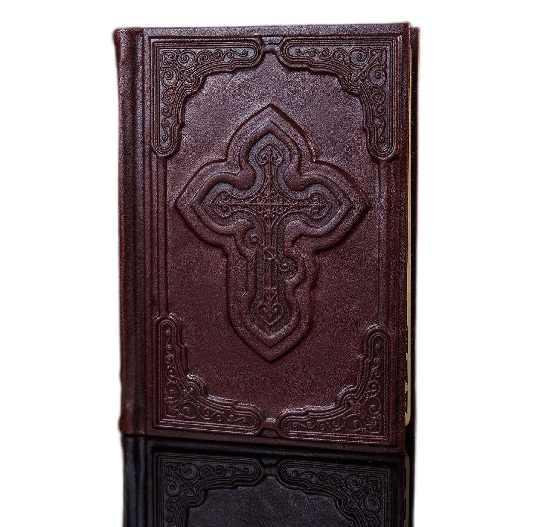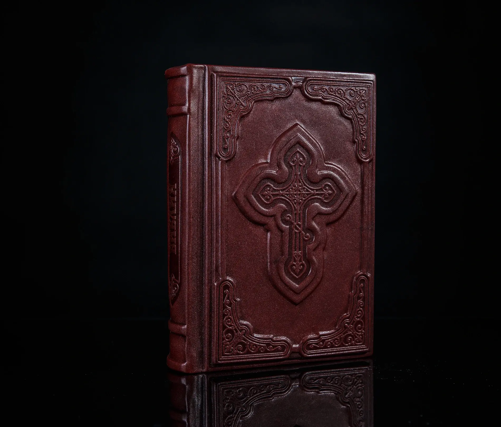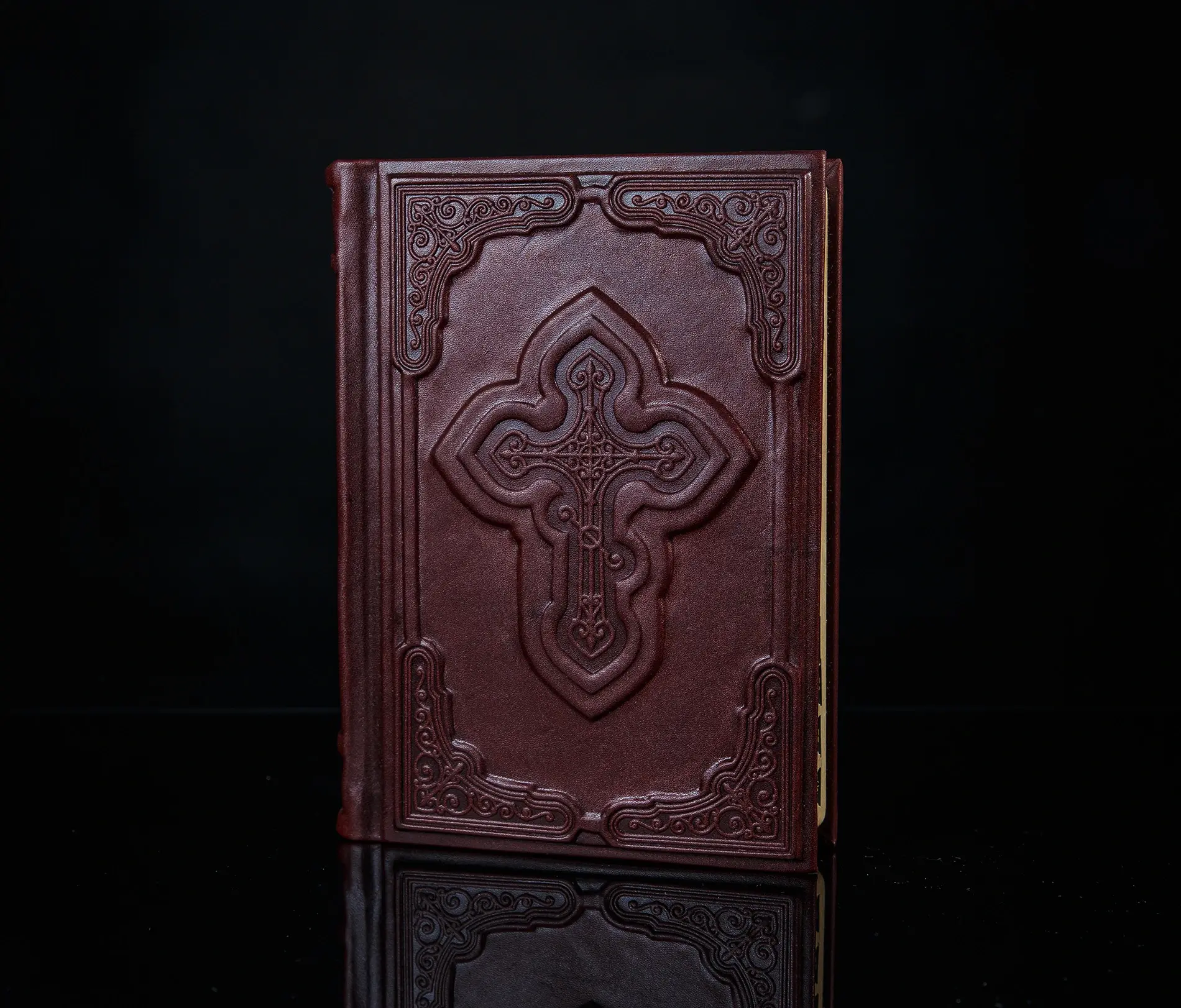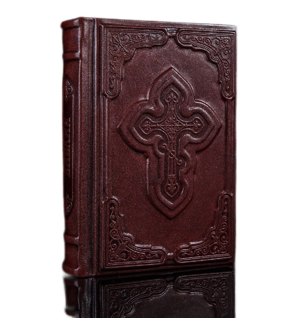 Переплет издания из мягкой натуральной кожи, это настоящий шедевр, созданный мастерской художника Олега Жданюка. Его дизайн переплета олицетворяет духовную важность этого произведения. Печать выполнена в два цвета. Выделенный бинтами корешок и золотой обрез символизируют особую святость этого издания, что делает эту книгу настоящим сокровищем для верующих.