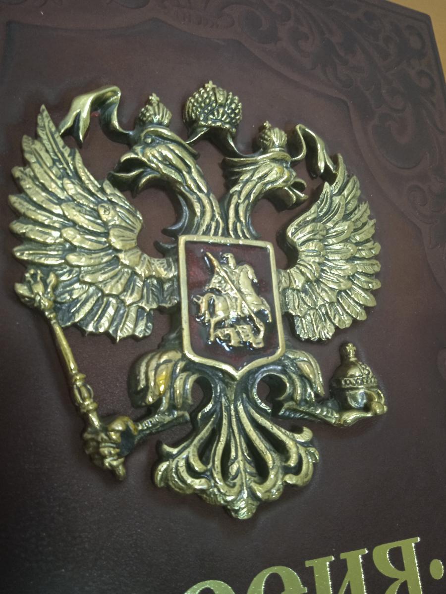 Оформление этого подарочного издания сделано на очень высоком уровне. Солидности придаёт литой российский герб в виде двуглавого орла, расписанный цветной эмалью. Сам кожаный переплет выполнен вручную с использованием техники художественного тиснения. Срез страниц тонирован золотом. Качественная полиграфия, мелованная бумага. Книга найдет своего читателя среди политиков, бизнесменов, историков.