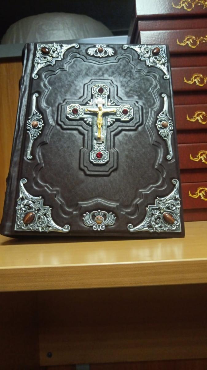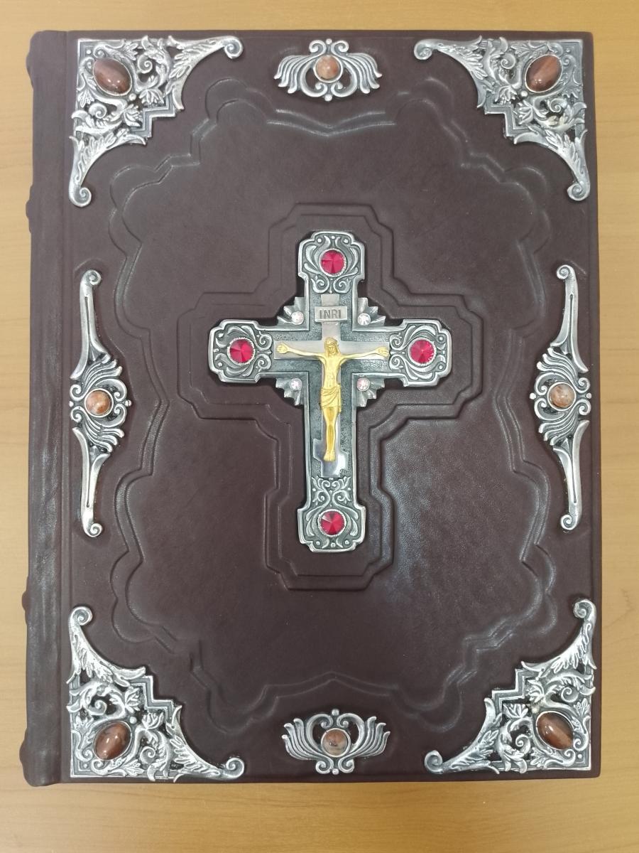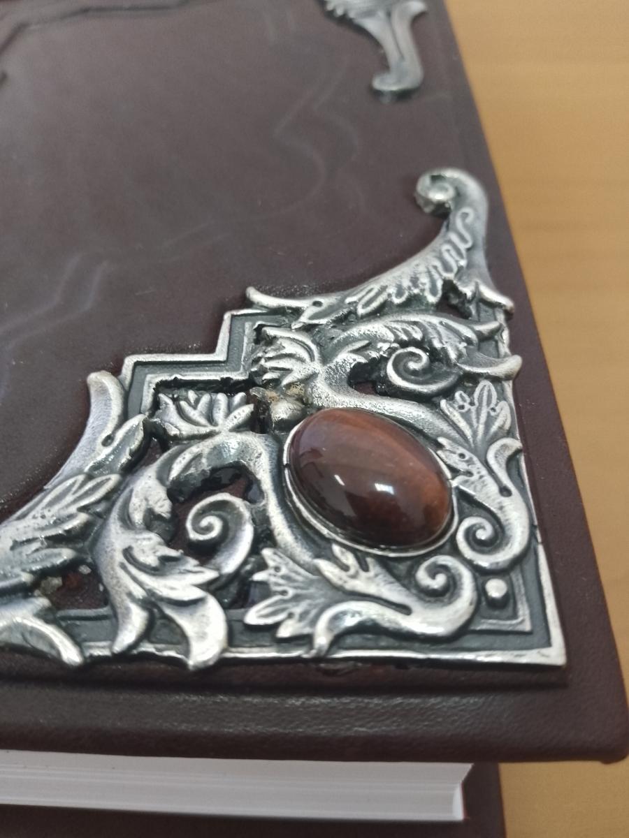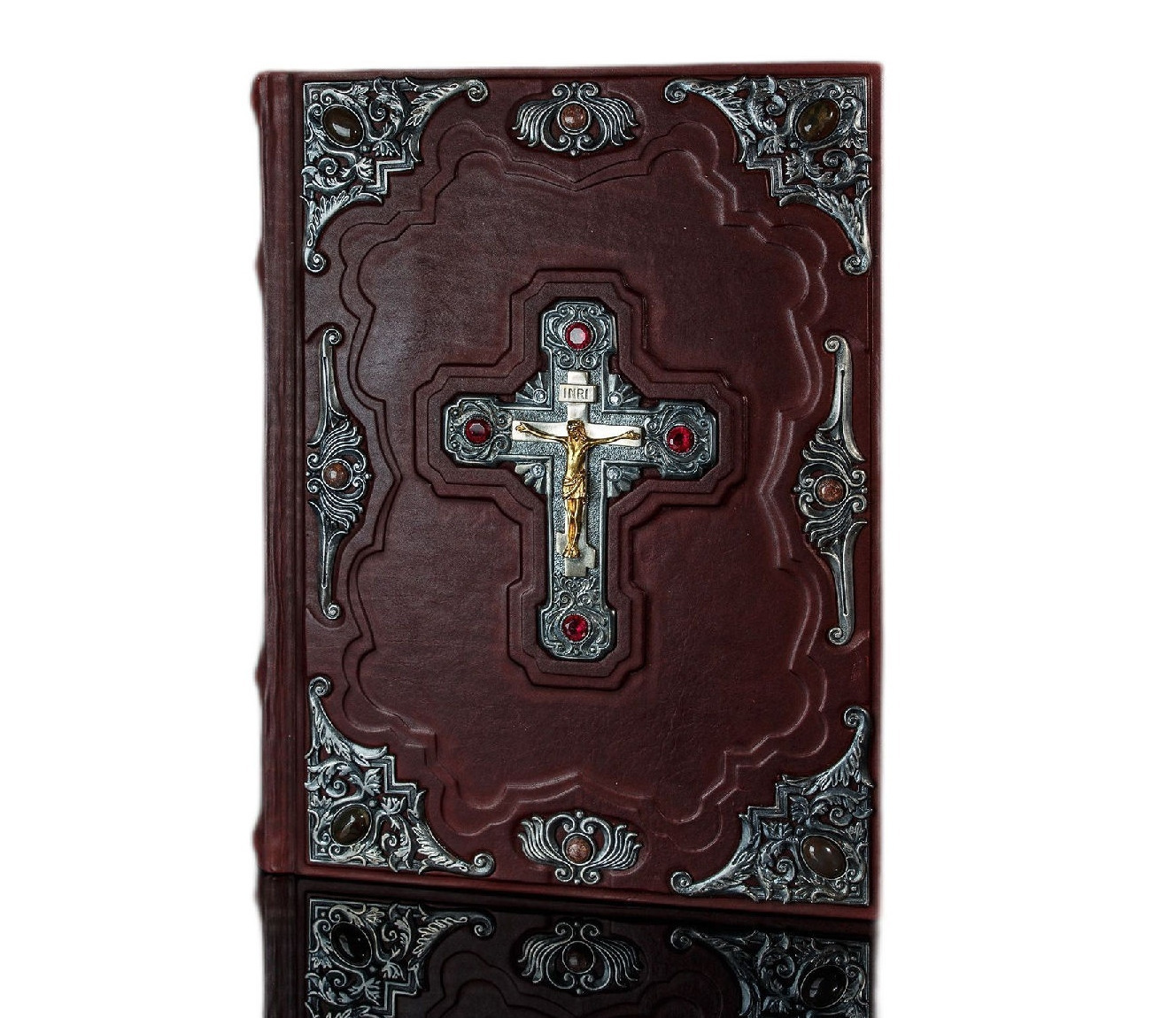 Эта Библия - исключительное издание, выполненное в переплете из мягкой натуральной кожи, украшенной посеребренными накладками и позолоченным распятием. Вставки из яшмы, а корешок украшен бинтами, что делает эту книгу еще более элегантной. Внутри вы найдете текст, напечатанный по благословению Святейшего Патриарха Московского и всея Руси Алексия II, в соответствии с синодальным переводом. Также в книге есть географические карты, которые могут быть полезными для чтения Библии.
