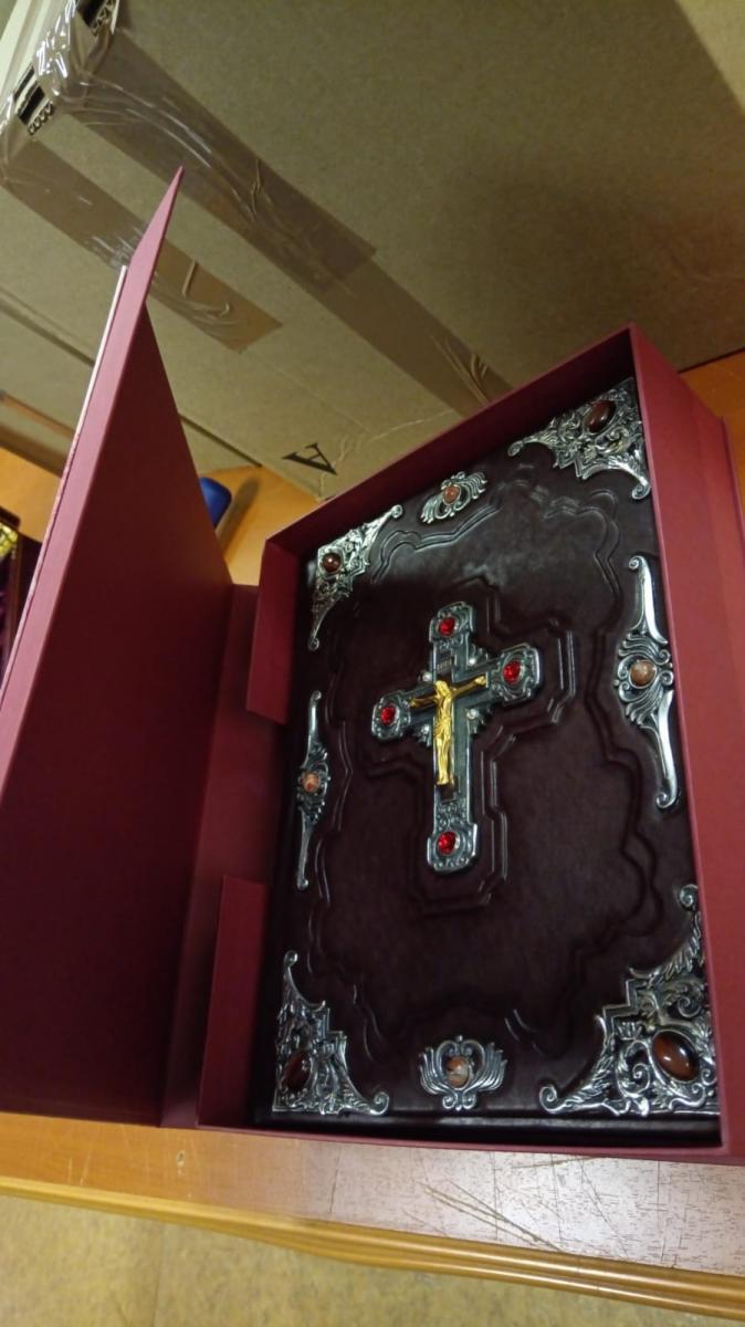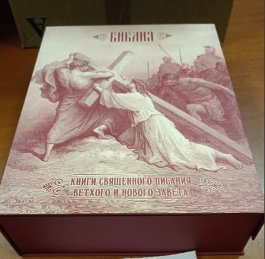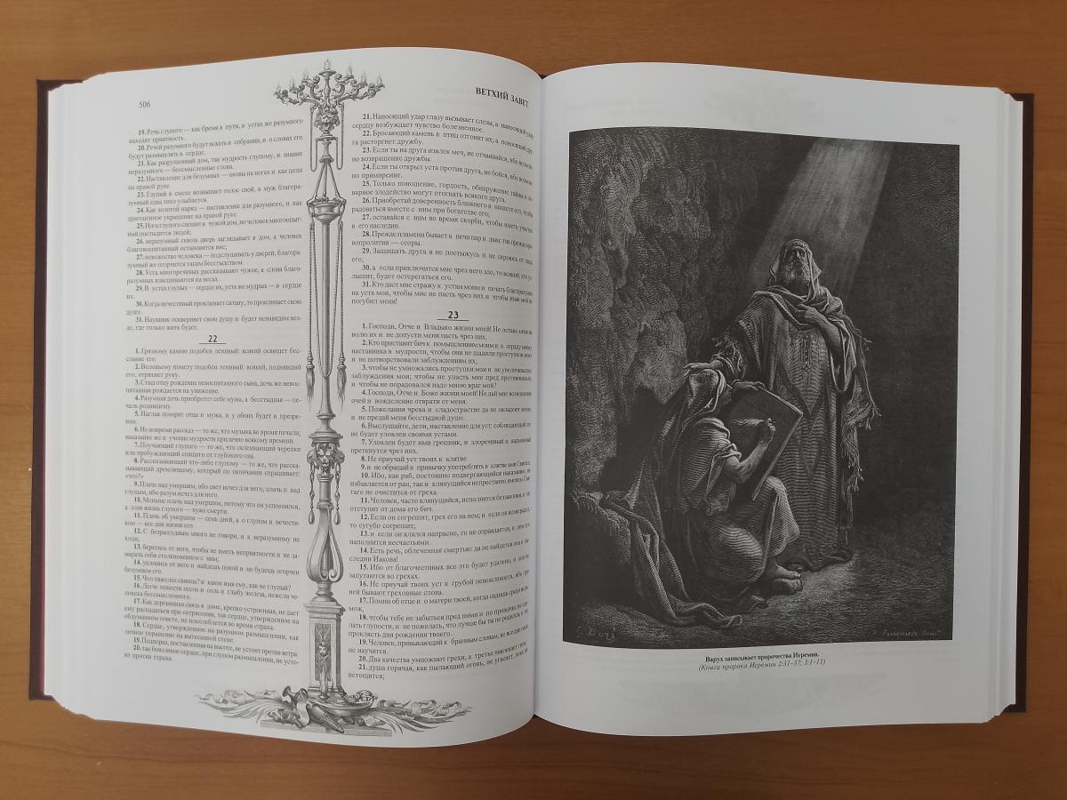 Дизайнерский футляр, выполненный из финского картона, оклеенный итальянской переплетной бумагой, хранит эту Библию в безопасности и сохраняет ее от пыли и повреждений. Он также содержит старинную гравюру французского художника-иллюстратора Гюстава Доре, которая добавляет книге особое очарование и уникальность.