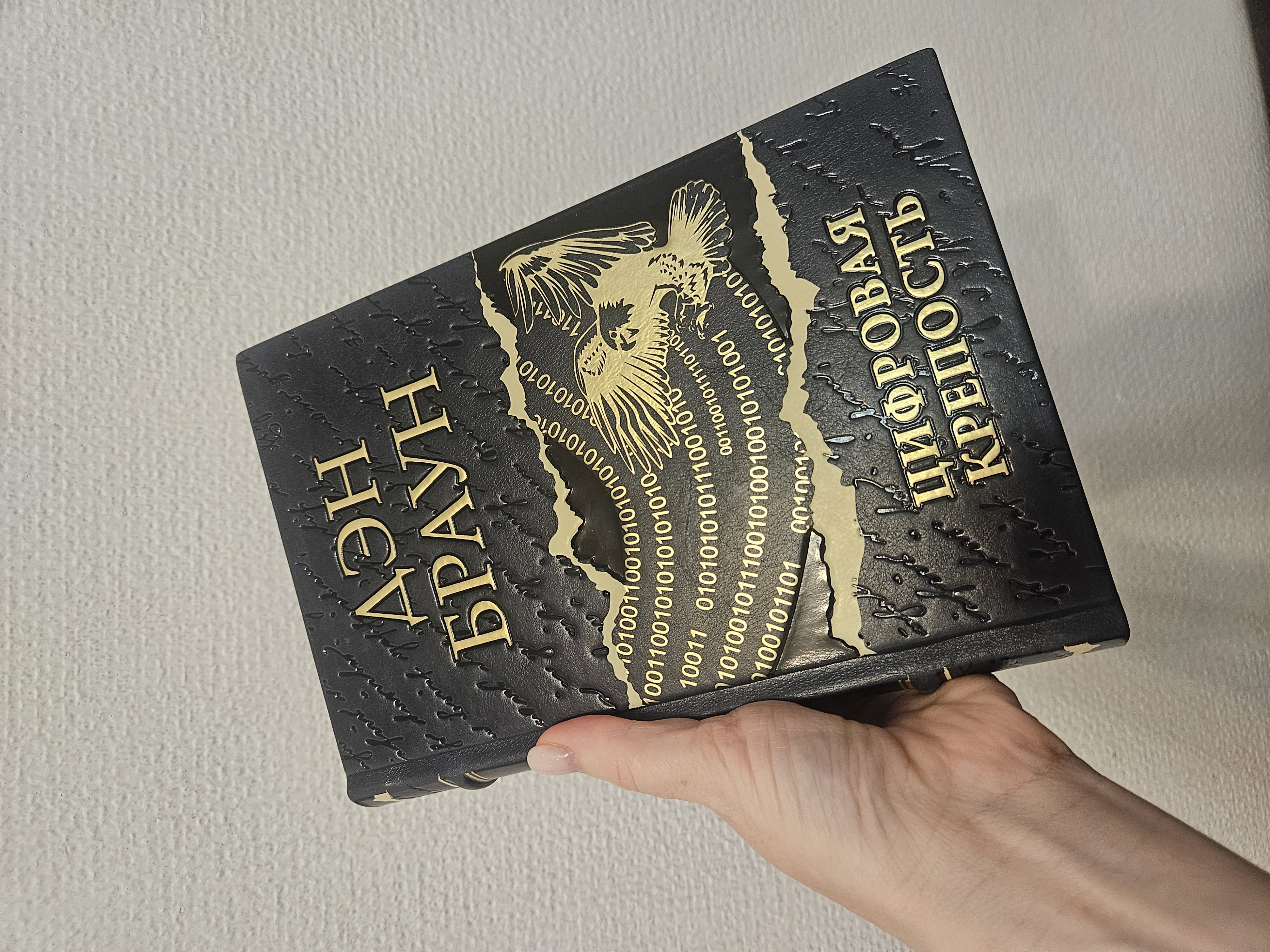 "Цифровая крепость" - роман американского автора Дэна Брауна. В произведении описывается конфликт между Агентством национальной безопасности, представленным выдающимся криптографом Сьюзан Флетчер, и загадочным преступником, угрожающим всей секретной информации Соединенных Штатов. Книга оформлена уникальным образом: она имеет художественный кожаный переплет с цветным и рельефным тиснением, а обрезы страниц украшены. Это издание упаковано в стильную подарочную коробку и выполнено вручную, включая индивидуальный дизайн обложки. Книжные блоки тщательно отшлифованы, а на обрезах страниц нанесен мраморный узор. Для этого издания использована насыщенная темно-синяя кожа, что подчеркивает жанр книги и демонстрирует высокое качество оформления.