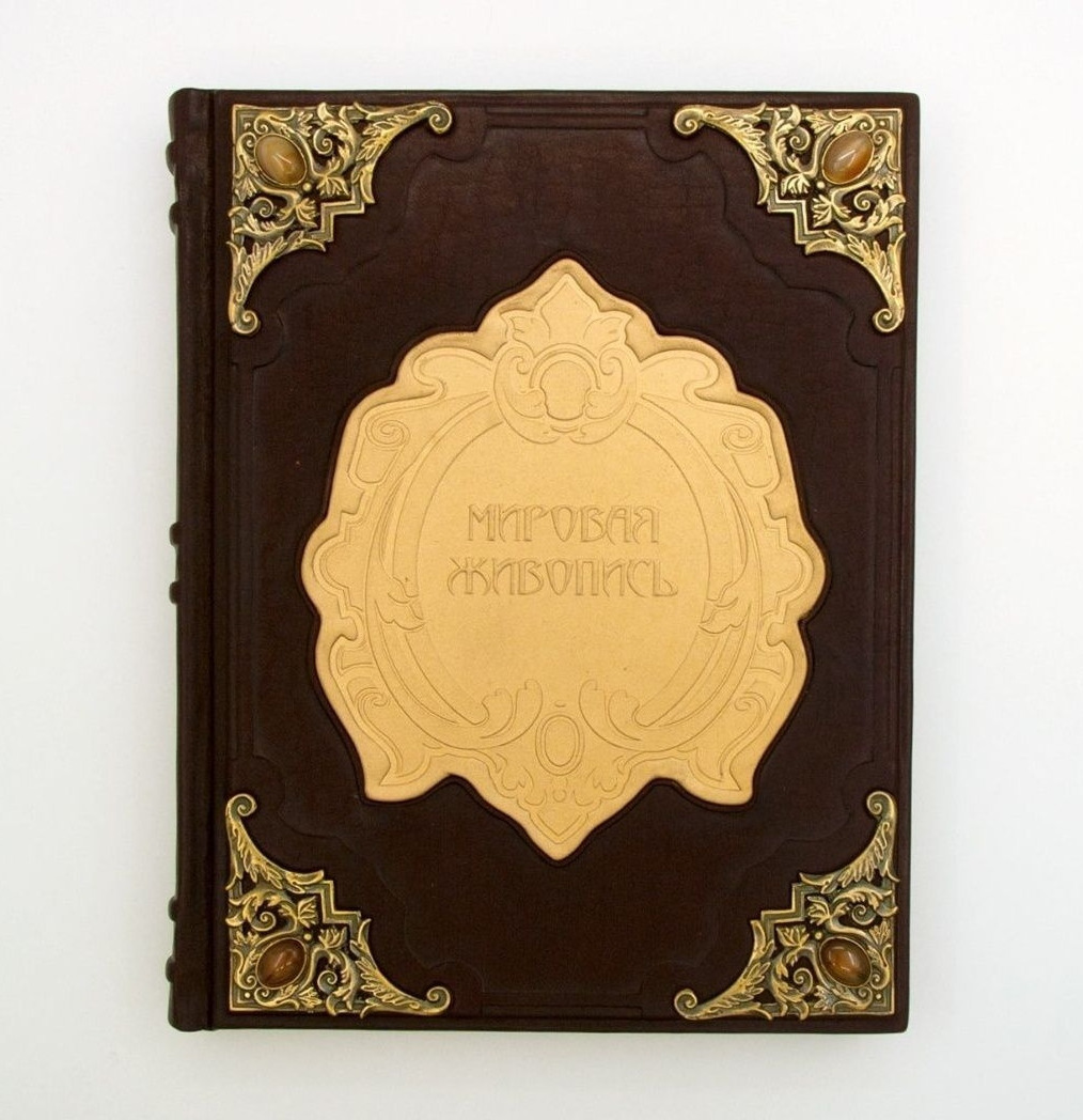 Переплет издания из мягкой телячьей кожи, дополнен бронзовыми "Славянскими" уголками, которые украшают лицевую сторону книги, с вставками из натуральной яшмы. Все эти элементы делают эту книгу уникальной. Центральная накладка из контрастной кожи с барельефным тиснением придает еще больший шарм данной книге.