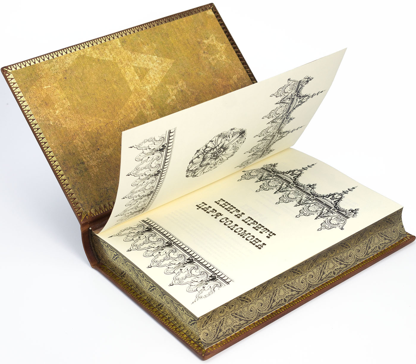 Ручная работа и золотой орнамент: Книжные блоки сшиты вручную, что гарантирует долговечность и безупречное раскрытие книги. Обрезы страниц бережно отшлифованы и тонированы, а их поверхность украшена изысканным золотым орнаментом, сверкающим при каждом движении.