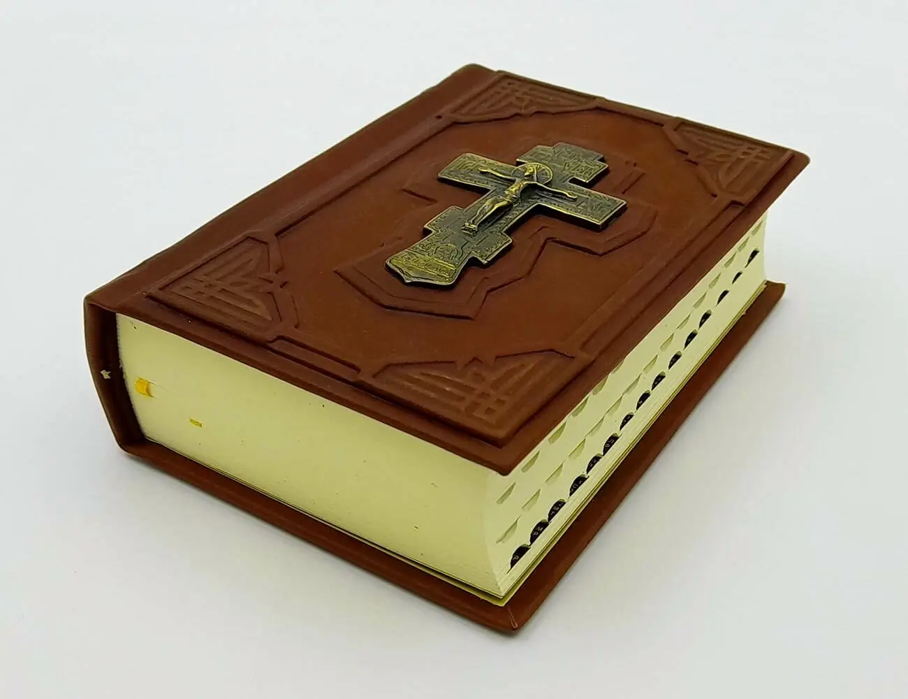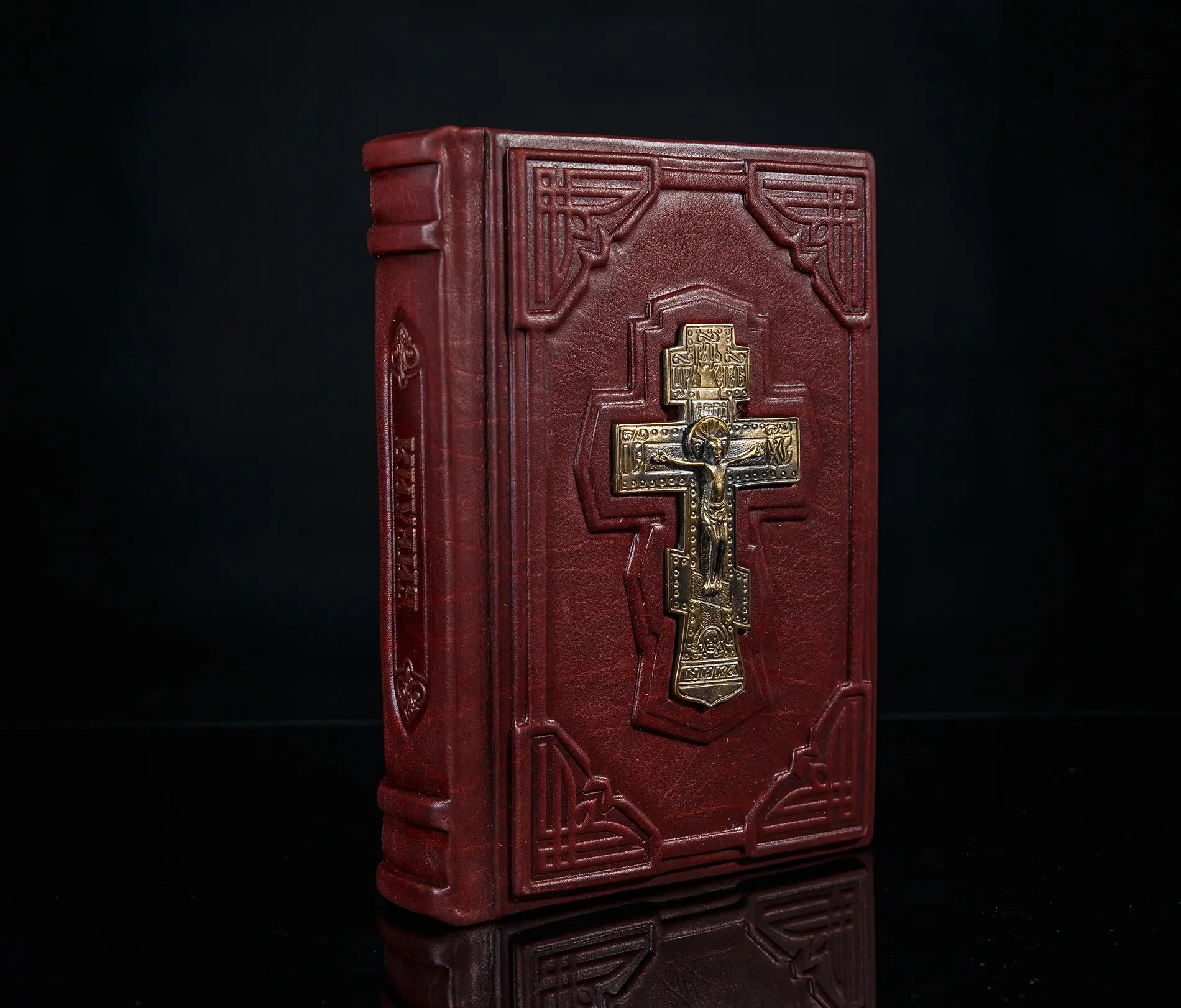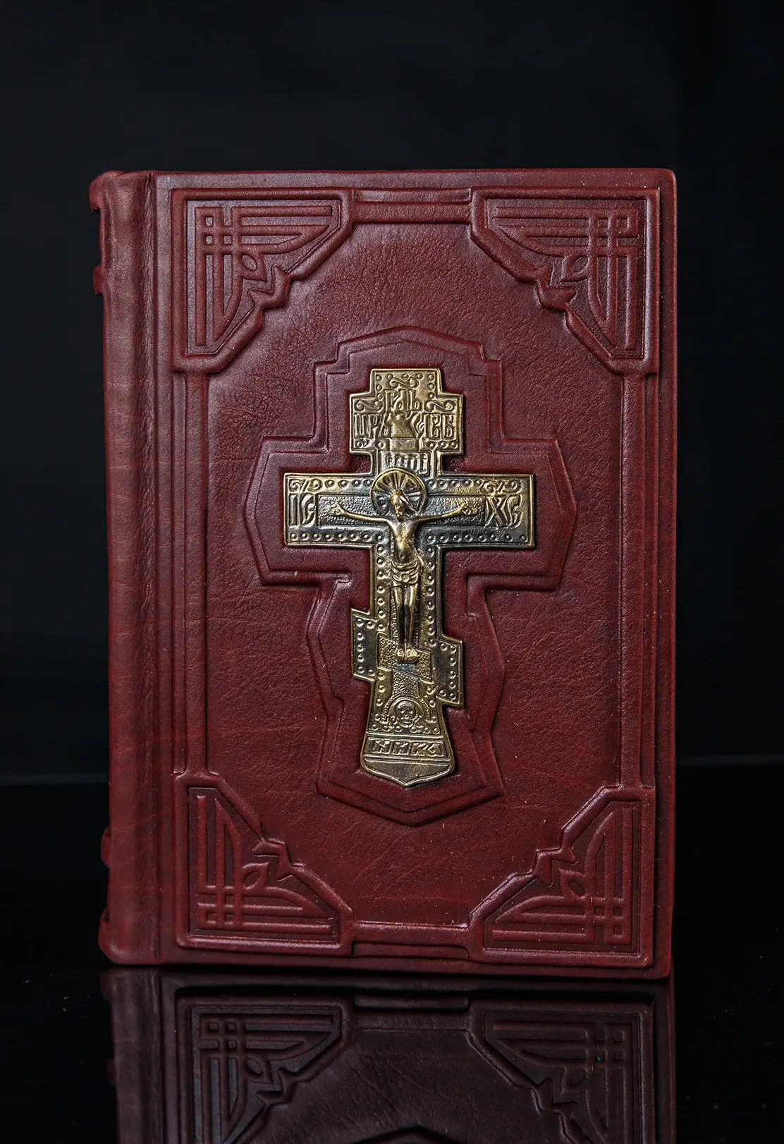 Книга в кожаном переплете "Библия малая с комментариями" — это изысканное издание, которое сочетает в себе духовную глубину и эстетическую красоту. Обложка, выполненная из высококачественной кожи, отличается прочностью и долговечностью, а бронзовый крест, элегантно вмонтированный на передней стороне, придает книге особый символический смысл и благородство.