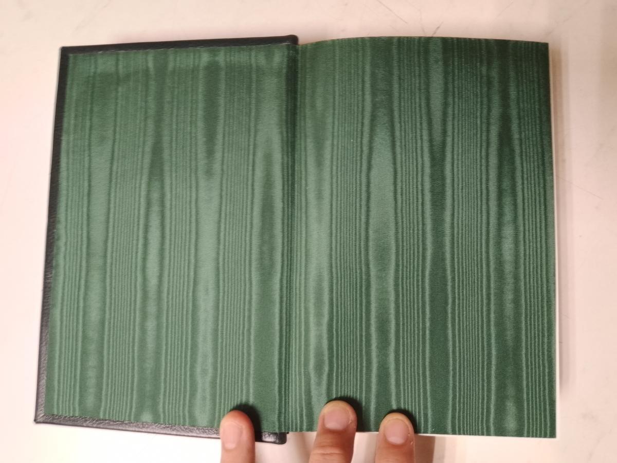 Шикарный переплет из натуральной кожи с филигранным литьем ручной работы и тиснением на коже. Срез страниц тонирован золотом, а форзац - муарный шелк.