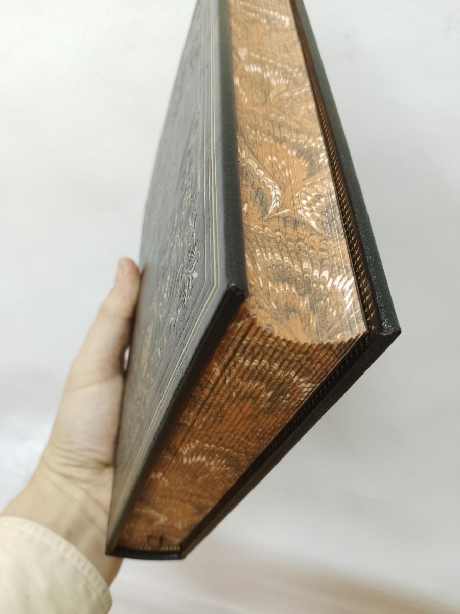 Переплет этой книги выполнен из высококачественной натуральной кожи с использованием блинтового и золотого тиснения. Кроме того, в переплете присутствует вставка из кожи другого цвета и фактуры, а форзацы богато оформлены дублями. Крашенный в тон переплетного материала обрез и ляссе придают книге законченный и стильный вид.
