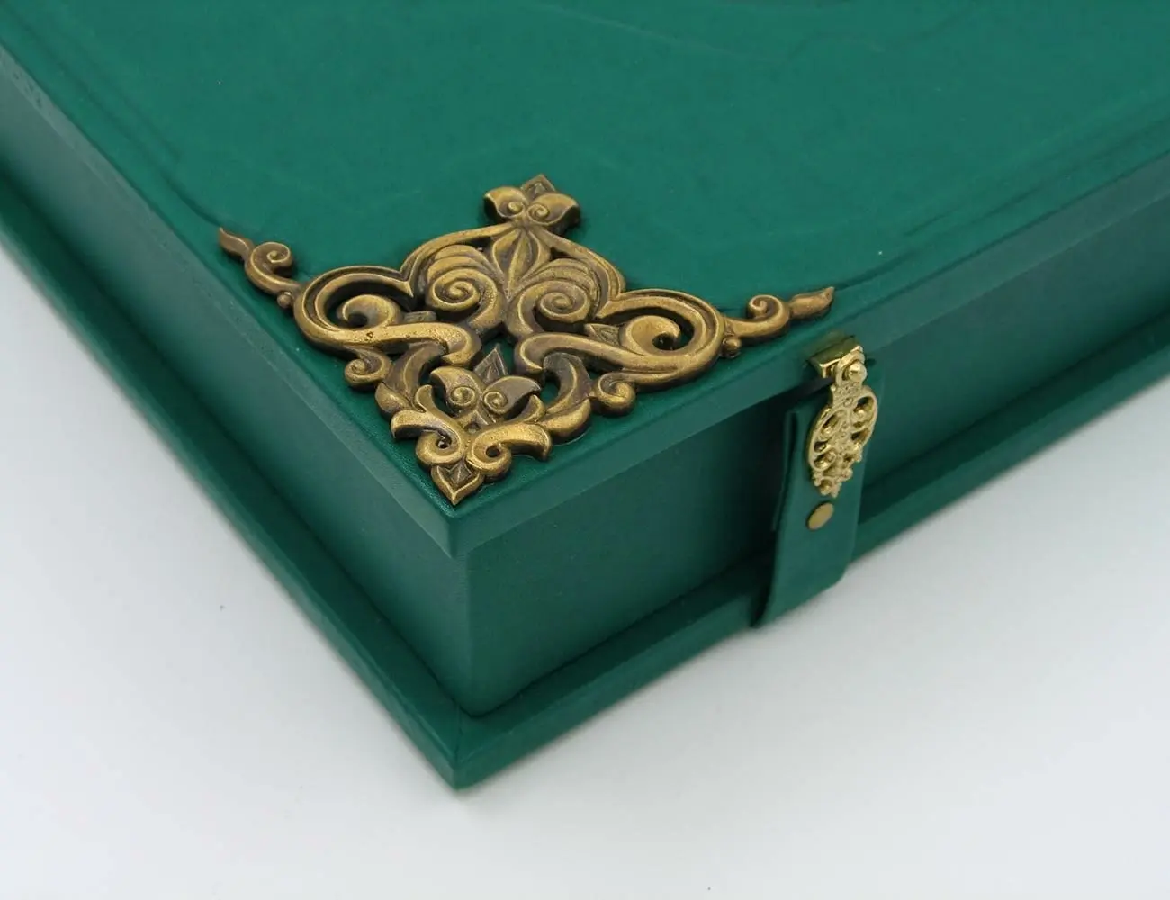 Обложка родословной книги выполнена из дерева (пластины МДФ) и вручную обтянута качественной натуральной кожей. Закрывается обложка двумя кожаными ремешками. Корешок футляра выделен бинтами (выпуклыми округлыми элементами). Лицевая сторона украшена блинтовым (т.е. выполненным без фольги) тиснением и 4-мя литыми бронзовыми уголками.