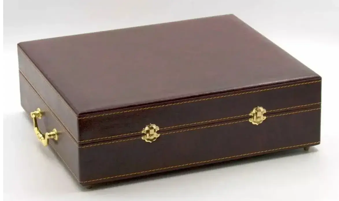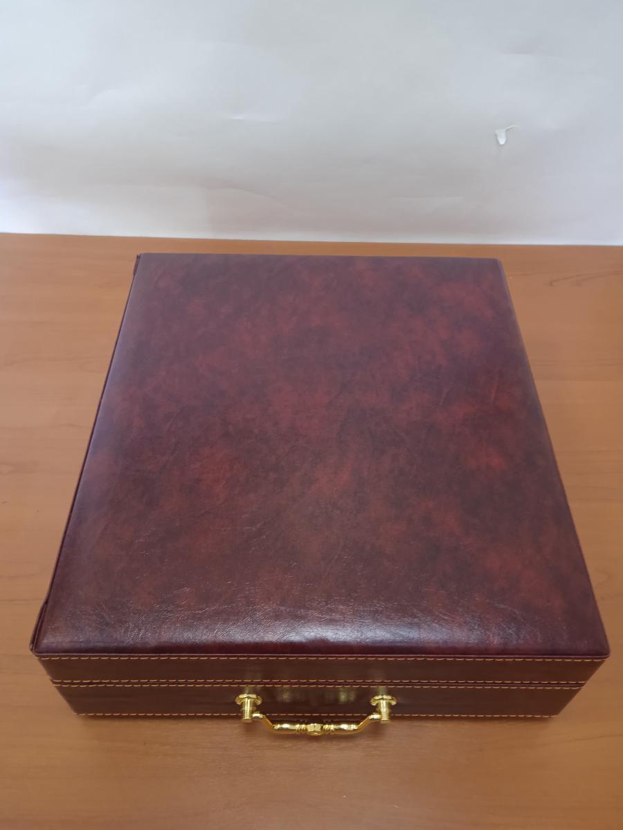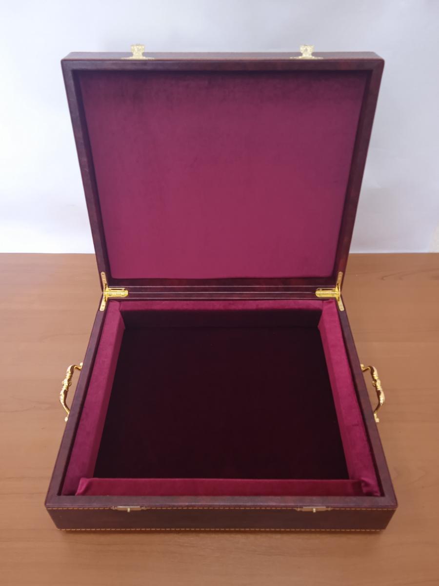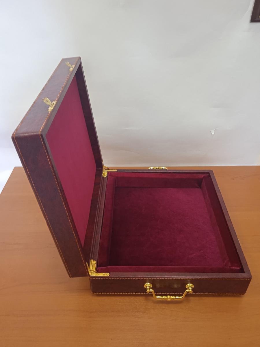 - Изысканный экстерьер: Прочная основа из МДФ обтянута премиальной экокожей, придающей ларцу благородный и респектабельный вид.