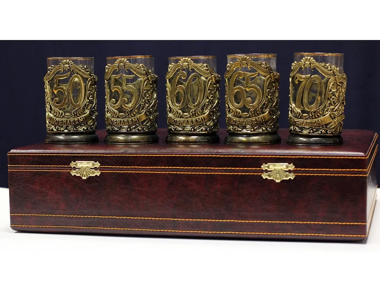 В наличии есть подстаканники с датами: 50, 55, 60, 65 и 70 лет.