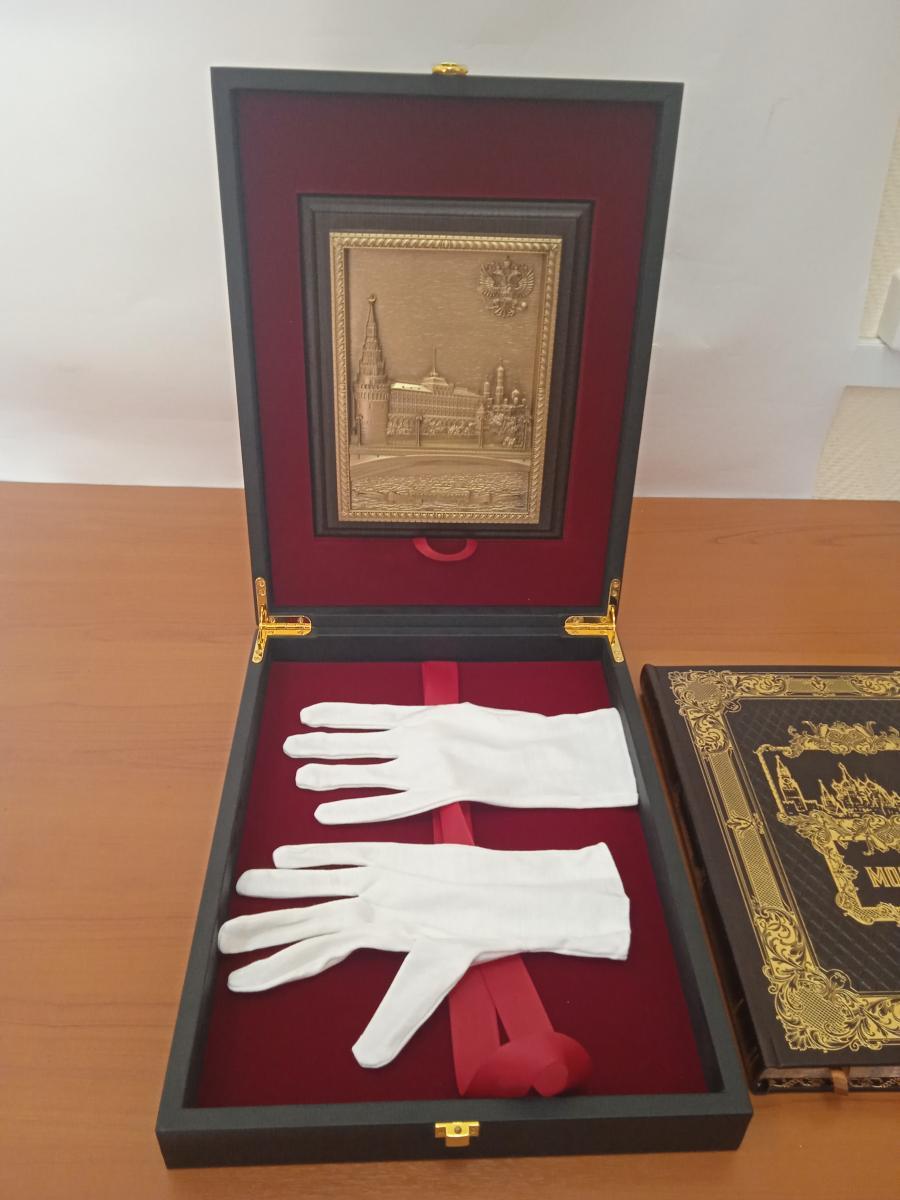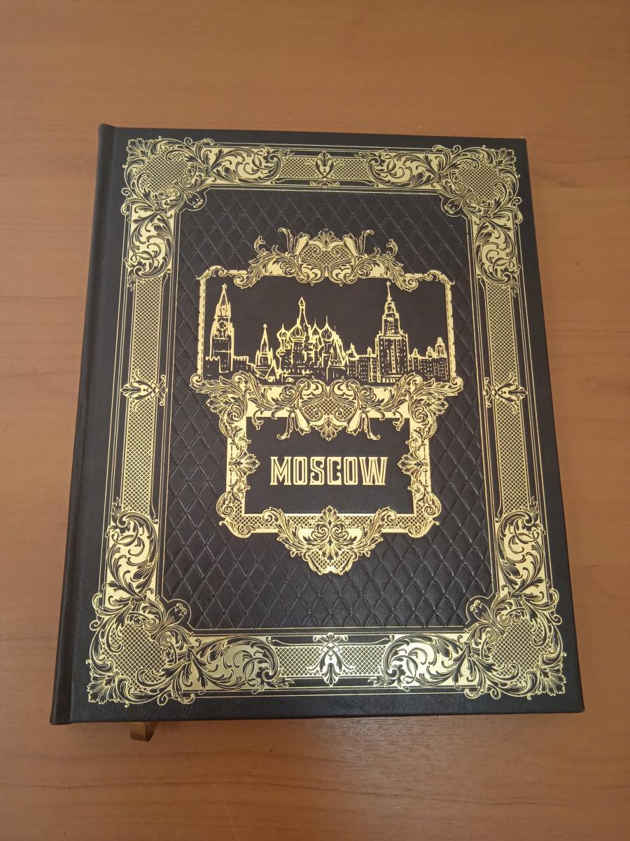 Это уникальный подарок иностранным партнерам, специальное издание на английском языке выпущено в кожаном переплете с памятной плакеткой "Москва-Кремль". Книга и плакетка упакованы в деревянную коробку, обтянутую натуральной кожей, коробка имеет замок. Плакетка из литьевого пластика на деревянной основе. Книга в переплете из кожи с золотым тиснением. Дизайнерский рисунок обреза страниц.