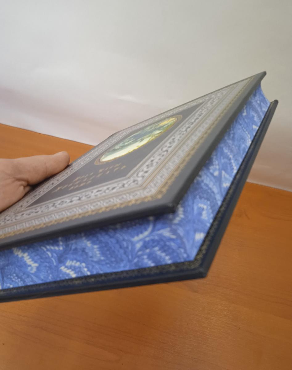 Цельнокожаный переплёт ручной работы украшен золотым и серебряным тиснением. Корешок декорирован бинтами. Текст книги напечатан на бумаге Palatina Avorio 100 Австрийского производства и дополнен цветными иллюстрациями. Обрез оформлен в технике "Перо павлина". Ляссе из шёлковой ленты. Форзац цельный из дизайнерской бумаги. Дублюра окатана золотом.