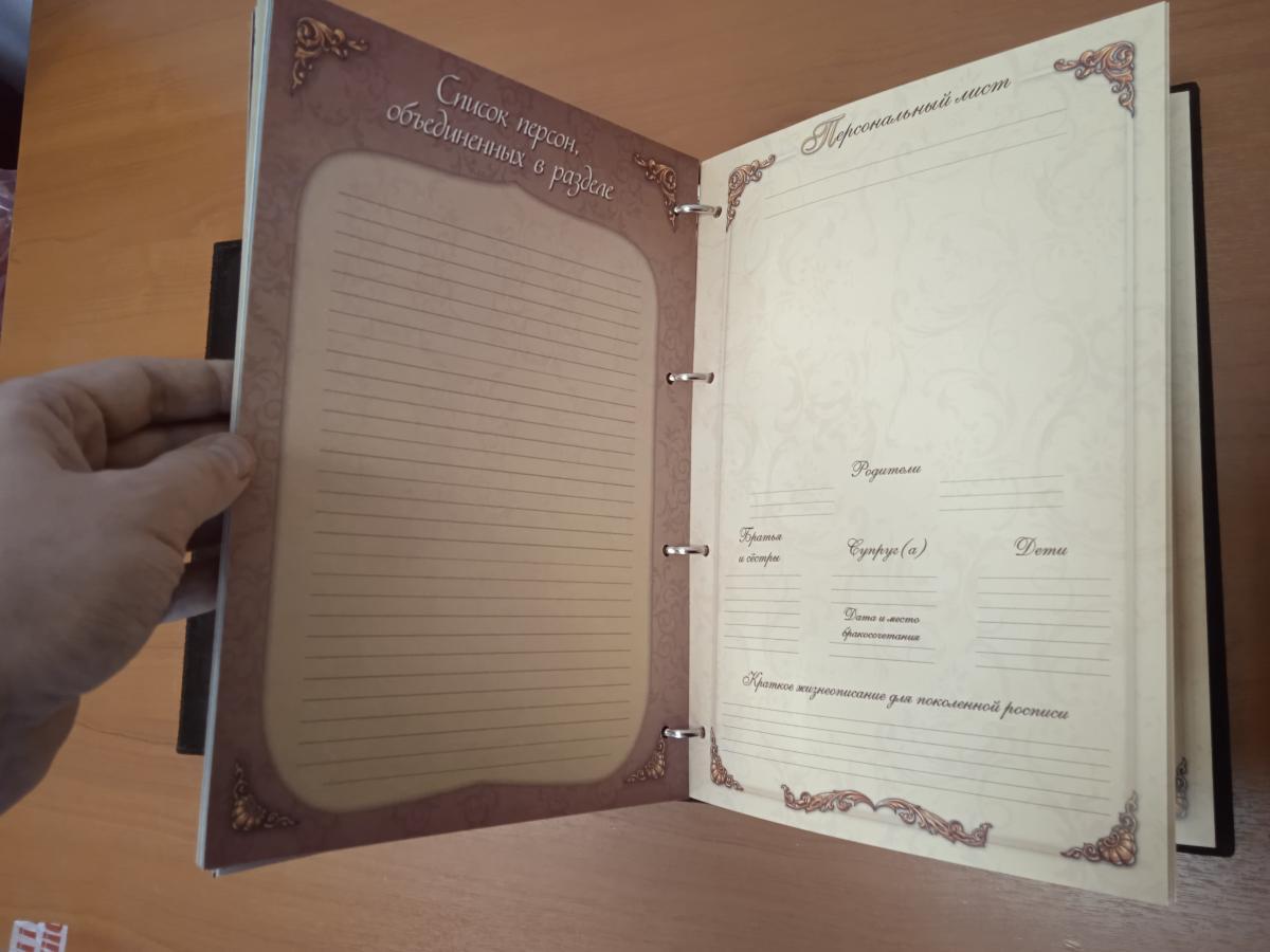 На каждый лист родословной книги можно наклеить фотографию любого размера. Фото можно приклеить или прикрепить на двусторонний скотч. На части листов имеются вырезанные уголки для фотографий.
