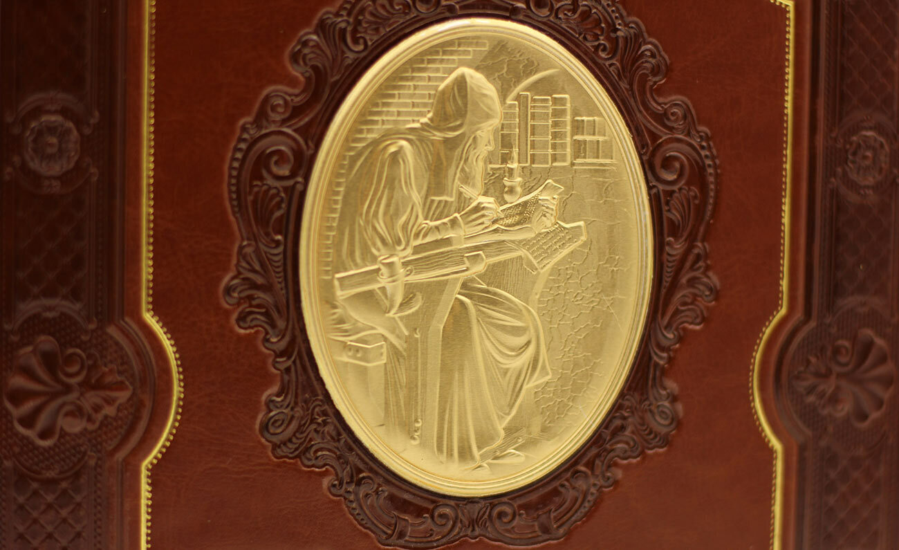 Взгляд притягивает изысканный блинтовой рельефный (конгревный) орнамент, обрамленный сверкающей золотой рамкой. В самом сердце обложки — уникальная накладка с барельефным изображением Нестора Летописца, выполненная в технике чеканки по металлу и покрытая изысканной патиной, придающей ей антикварный шарм. Вокруг накладки расцветает рельефный блинтовой картуш, усиливая ощущение величия. Название книги нанесено мерцающим золотым тиснением, добавляющим последний штрих роскоши.