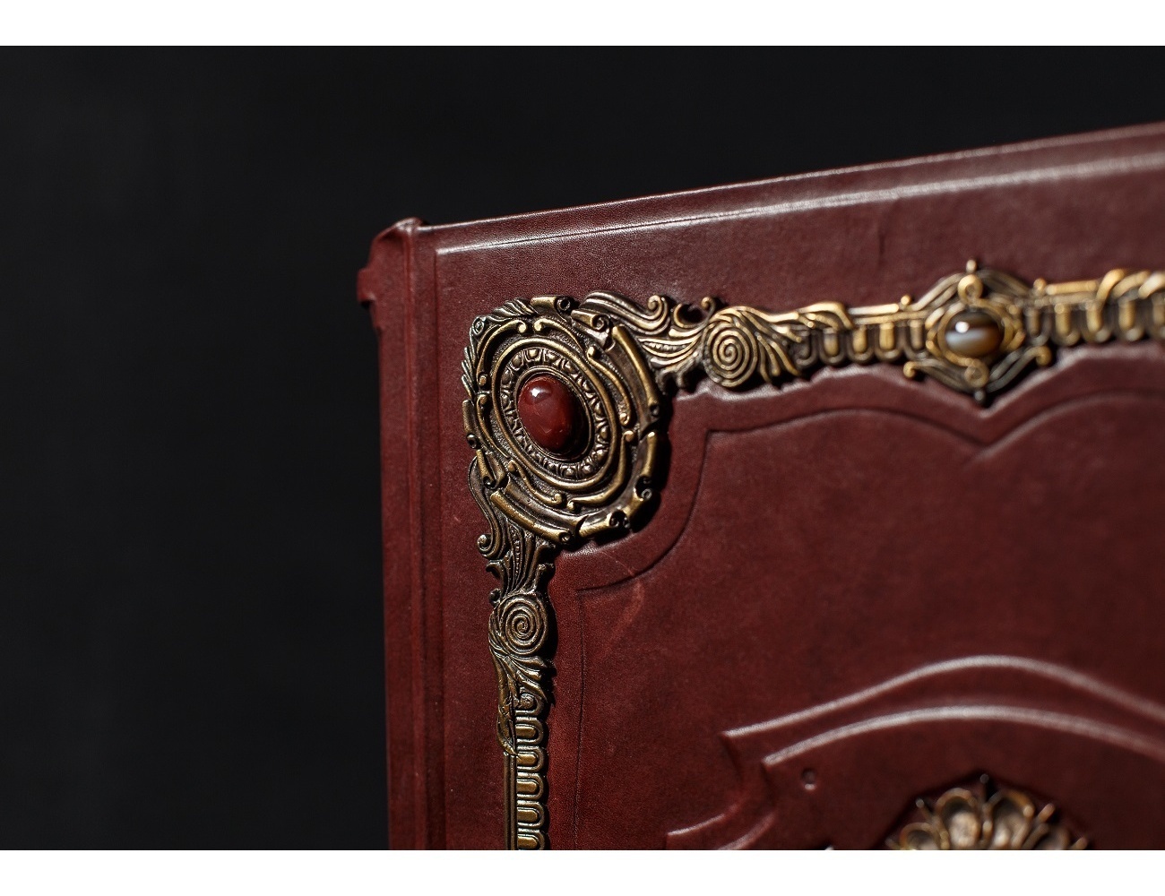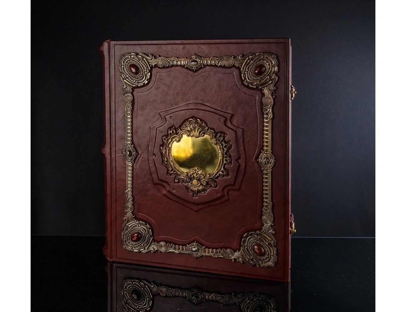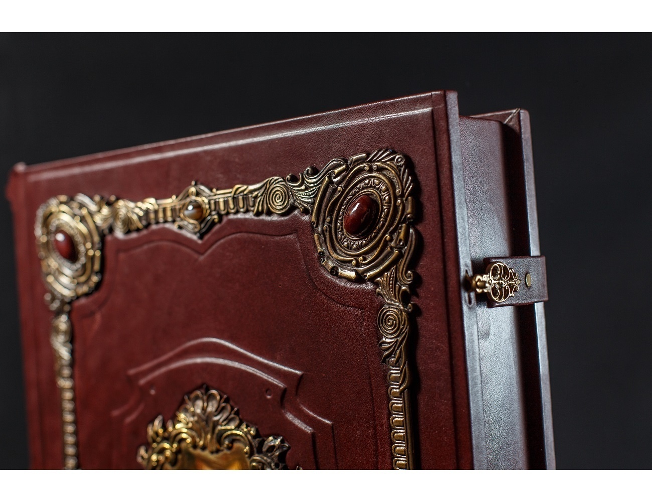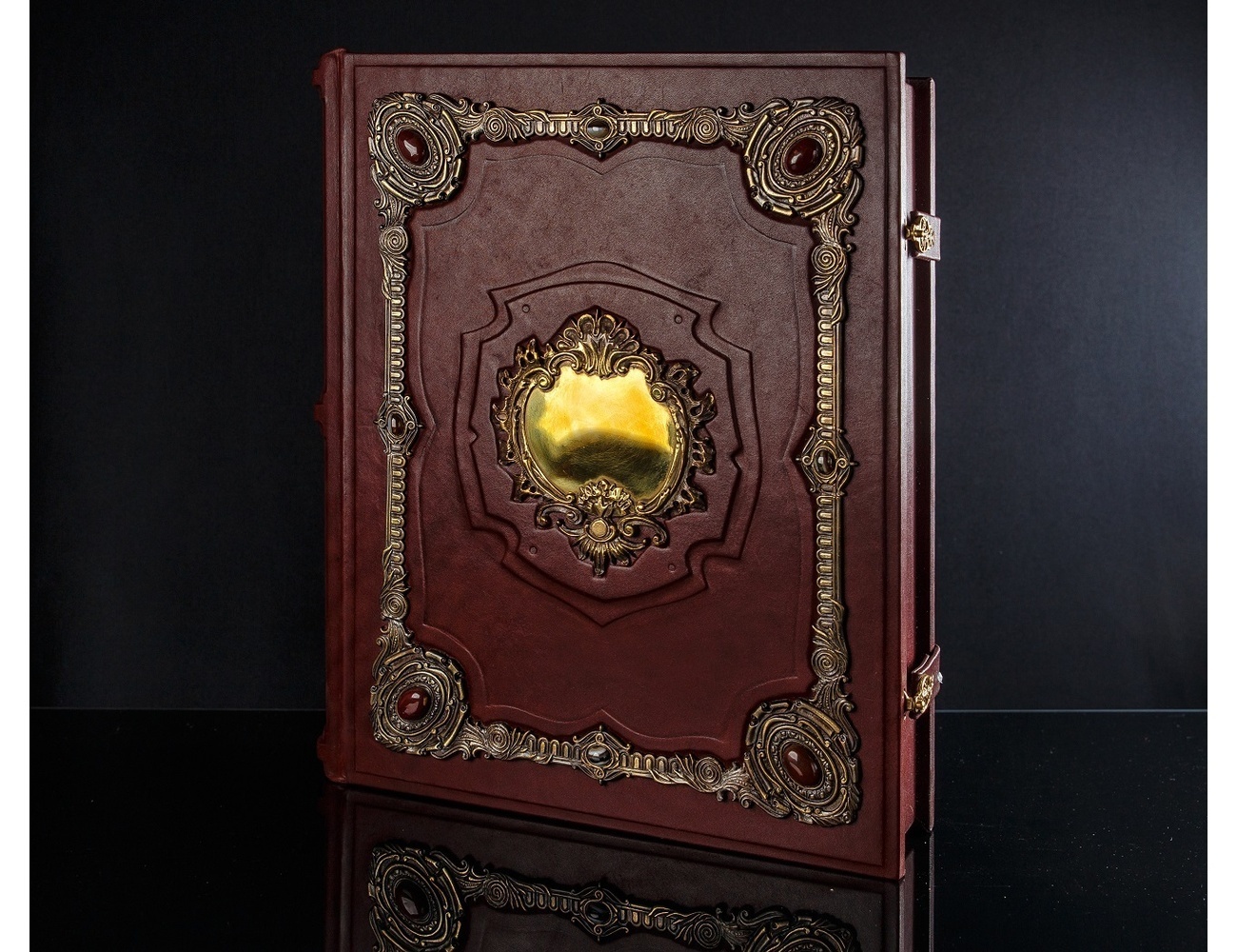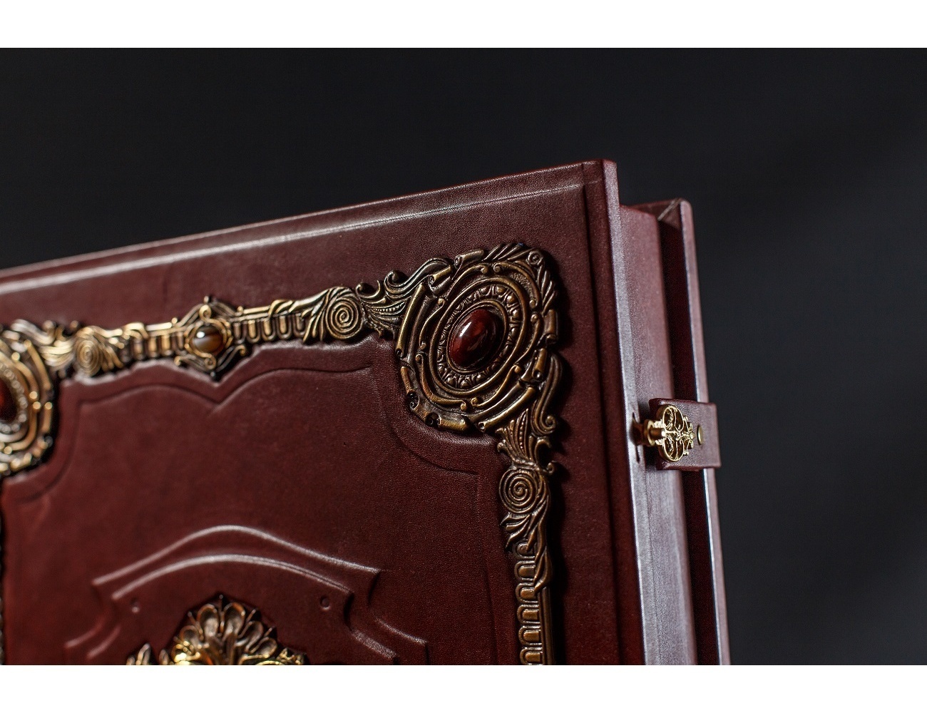 Крышка футляра обрамлена массивной бронзовой рамкой в неповторимом стиле «Питерский модерн», инкрустированной вставками из натуральной, благородной яшмы – камня, издавна ценимого за свою красоту и долговечность. В центре композиции – роскошная бронзовая накладка в стиле «Барокко» с идеально полированной поверхностью, идеальной для нанесения фамильной монограммы или памятной гравировки, что делает каждую книгу поистине уникальной. Завершают образ элегантные кожаные ремешки, увенчанные изящными бронзовыми книжными замками, которые гармонично перекликаются с общим дизайном накладок, добавляя нотку винтажной роскоши. Авторский дизайн переплета создан в мастерской художника Олега Жданюка, и каждый экземпляр носит оттиск его личного клейма, гарантируя подлинность и эксклюзивность.