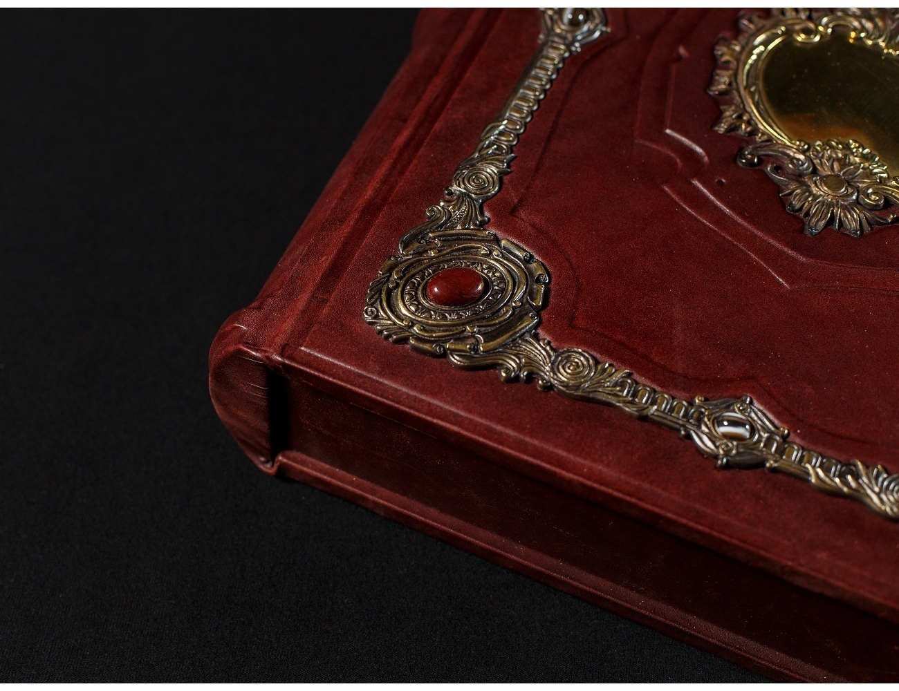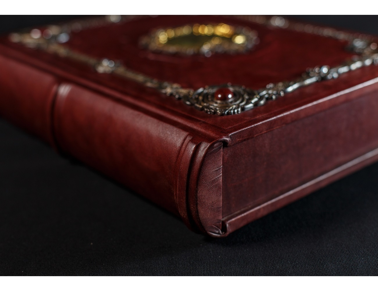Каждый экземпляр является результатом кропотливой ручной работы и отражает тонкий дизайнерский замысел. Футляр книги выполнен на прочной основе из МДФ, виртуозно вручную обтянут благородной натуральной кожей высшего качества. Изысканный корешок футляра украшен рельефными бинтами, подчеркивающими классическую элегантность переплета.