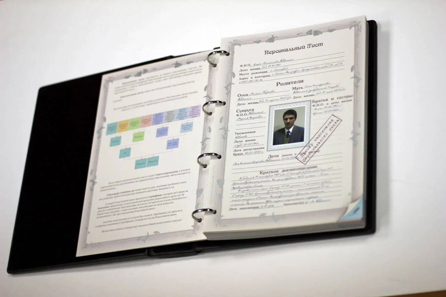 Родословная книга — это семейный фотоальбом с биографиями и интересными событиями из жизни семьи. В родословную книгу можно внести все ваше генеалогическое древо на множество поколений назад.