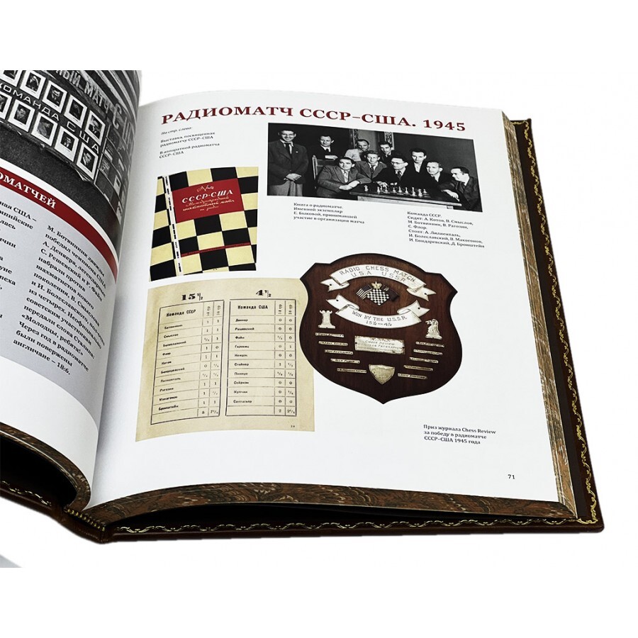 Книга подарочная в кожаном переплете "Шахматы в СССР. Иллюстрированная история" предлагает уникальный взгляд на семидесятилетнюю историю советских шахмат, отражая их эволюцию от немого кино и телеграфных игр до эпохи знаменитых чемпионов и массовых сеансов. Он демонстрирует, как шахматы стали важным культурным явлением XX века, превращая интеллектуальное увлечение в мощный инструмент развития страны.