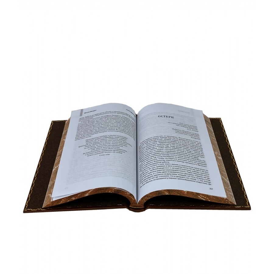 Эта книга имеет уникальный оформление, включающее в себя цельнокожаный переплет ручной работы, который украшен цветной кожаной вставкой, а также золотым и блинтовым тиснением. Корешок книги декорирован бинтами, а текст напечатан на офсетной бумаге.