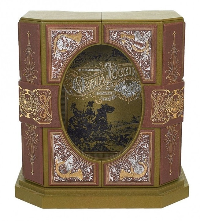Издание оформлено в французском цельнокожаном переплете, выполненном вручную и украшенном цветной кожаной вставкой, а также золотым и цветным тиснением. Корешок декорирован бинтами, а текст напечатан на бумаге австрийского производства и дополнен цветными иллюстрациями. Обрез торшонирован с нанесением орнамента, а ляссе выполнено из шёлковой ленты. Форзац выполнен в технике "муар", а дублюра окатана золотом. Книга поставляется в кожаном футляре, который был вдохновлен дизайном книги. Это уникальное подарочное издание приятно удивит и займет достойное место на полке у настоящего ценителя истории охоты.